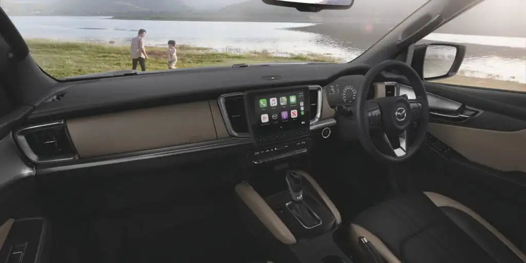 وبالانتقال إلى المقصورة الداخلية، تحتفظ BT-50 بشاشة تعمل باللمس مقاس 9 بوصات لنظام المعلومات والترفيه أو 7 بوصات في الطرازات الأساسية. كما توفر الآن أيضاً نظامي Apple CarPlay وAndroid Auto لاسلكياً. ومع ذلك، على عكس سيارة D-Max، التي حصلت على مجموعة عدادات رقمية جديدة مقاس 7 بوصة، تحافظ BT-50 على عداداتها التقليدية مع شاشة أصغر حجمًا مقاس 4.2 بوصة بينهما.