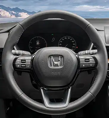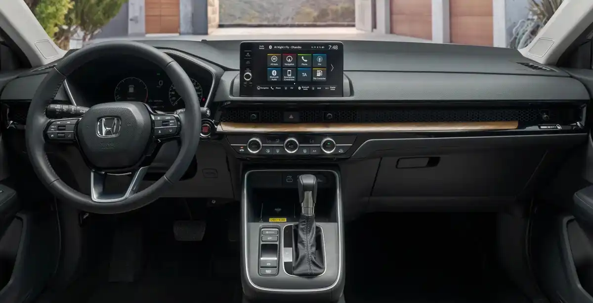 يتميز هوندا CR-V بتصميم بسيط وتقليدي نسبيًا. أسفل الشاشة التي تعمل باللمس بقياس 9 بوصات، يوجد فتحة تهوية على طراز الشبك. تليها وحدة التحكم بالتكييف وأزرار الوظائف الشائعة مع عروض رقمية على مقابض التحكم بالمناخ. يبقى ناقل الحركة ميكانيكيًا ويقع بالقرب من جانب السائق مع أزرار للركن التلقائي وغيرها من الوظائف الإضافية الشائعة الاستخدام. ومع ذلك، فإن تغطية الجلد داخل سيارة CR-V محدودة، إذ تتركز بشكل أساسي على عجلة القيادة والمقاعد، وكلاهما مغطى بالكامل بالجلد الطبيعي، مما يضيف لمسة من الفخامة.