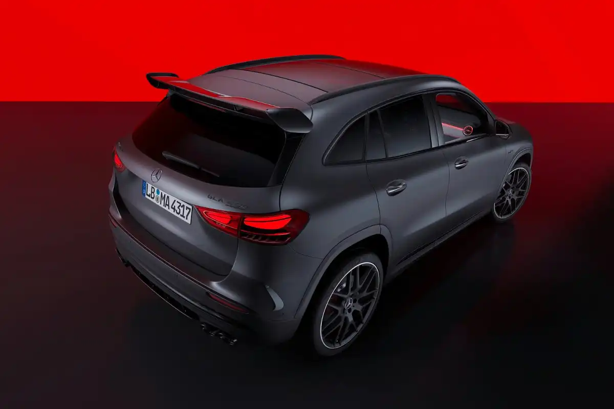 The wheel arch extensions of the AMG GLA 45 are no longer black; they have been updated to match the body color. Other exterior modifications include updated LED taillights, red brakes, and standard 19-inch wheels.