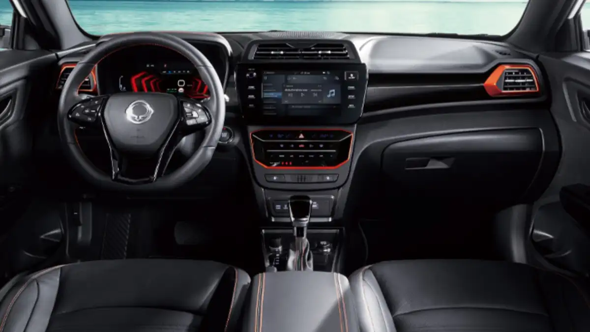 The 2024 SsangYong XLV offers a spacious interior, including a trunk with hooks for bags and a storage net, along with an additional storage compartment below. Luxurious leather accents on the door handles and dashboard add a touch of luxury, with seating for five available in either fabric or leather depending on the trim. The front seats are adjustable, while the rear seats can be folded in a 6:4 ratio to increase storage capacity. The steering wheel is wrapped in leather and features audio system control buttons for a 6-speaker system, along with dual-zone automatic climate control. Modern technologies include keyless smart entry and a push-button start, a 7-inch touchscreen infotainment system compatible with Apple CarPlay and Android Auto, supporting MP3 media playback, AUX audio input, USB data and charging ports, and HDMI display output.