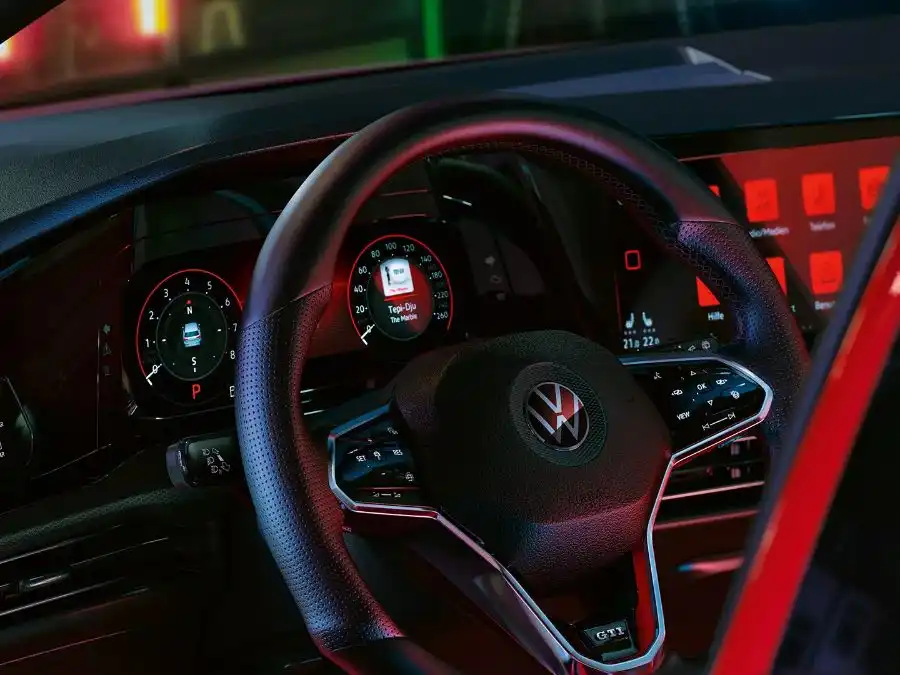 The interior of the 2024 Volkswagen Golf GTI boasts a sporty character with high comfort levels in both front and rear seats. The top of the dashboard features two 10-inch displays for the entertainment system and digital gauges, wrapped in high-quality soft leather with multiple storage spaces. The vehicle supports natural voice commands and Amazon Alexa, with an option for a head-up display to project information onto the windshield. A premium Harman Kardon audio system is also available, along with wireless phone charging support and optional ambient lighting in 10 colors, enhancing cabin space and luggage capacity.