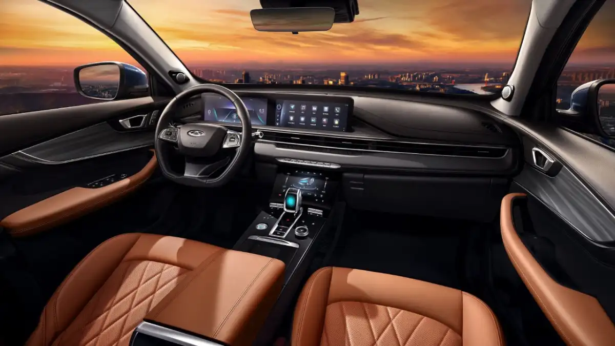 The interior of the 2024 Chery Tiggo 8 Pro Max is spacious and luxurious, with seven seats distributed across three rows covered in high-quality leather. The front seats offer electric adjustment with ventilation features, along with a memory function to save seating positions. Interior features include a multifunctional leather-wrapped steering wheel and a panoramic sunroof, as well as an auto-dimming rearview mirror.