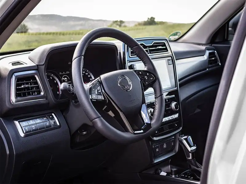 The interior of the 2024 SsangYong Tivoli boasts high standards of comfort and technology, featuring luxurious leather upholstery covering the seats and steering wheel, creating an atmosphere of endless elegance and comfort. The vehicle is equipped with an 8 or 10-inch entertainment and information system display that supports Apple CarPlay and Android Auto, allowing for a seamless connectivity experience and complete driving entertainment. The advanced audio system, equipped with six speakers, enhances the listening experience, while the one-button start system offers convenience in use.