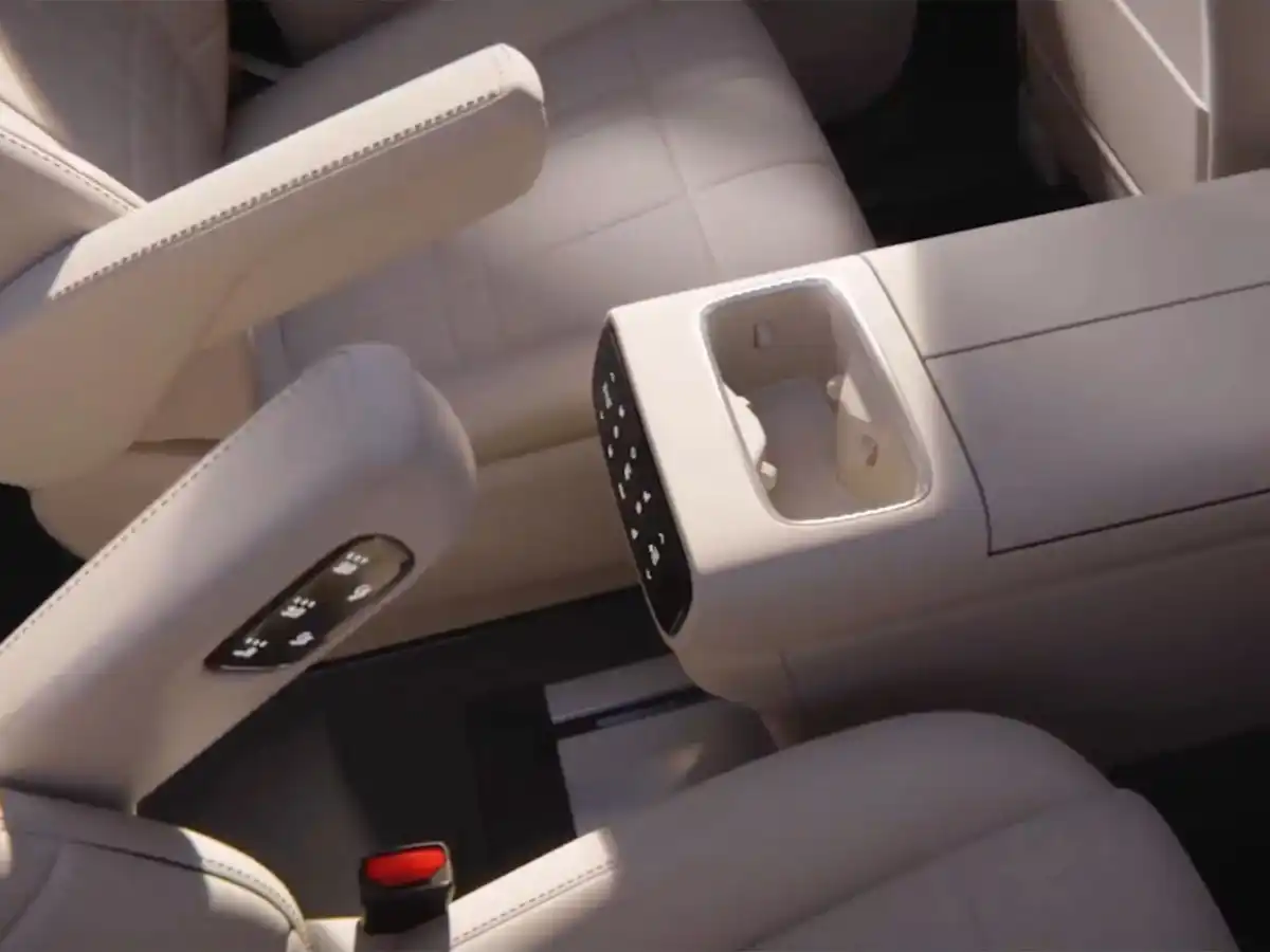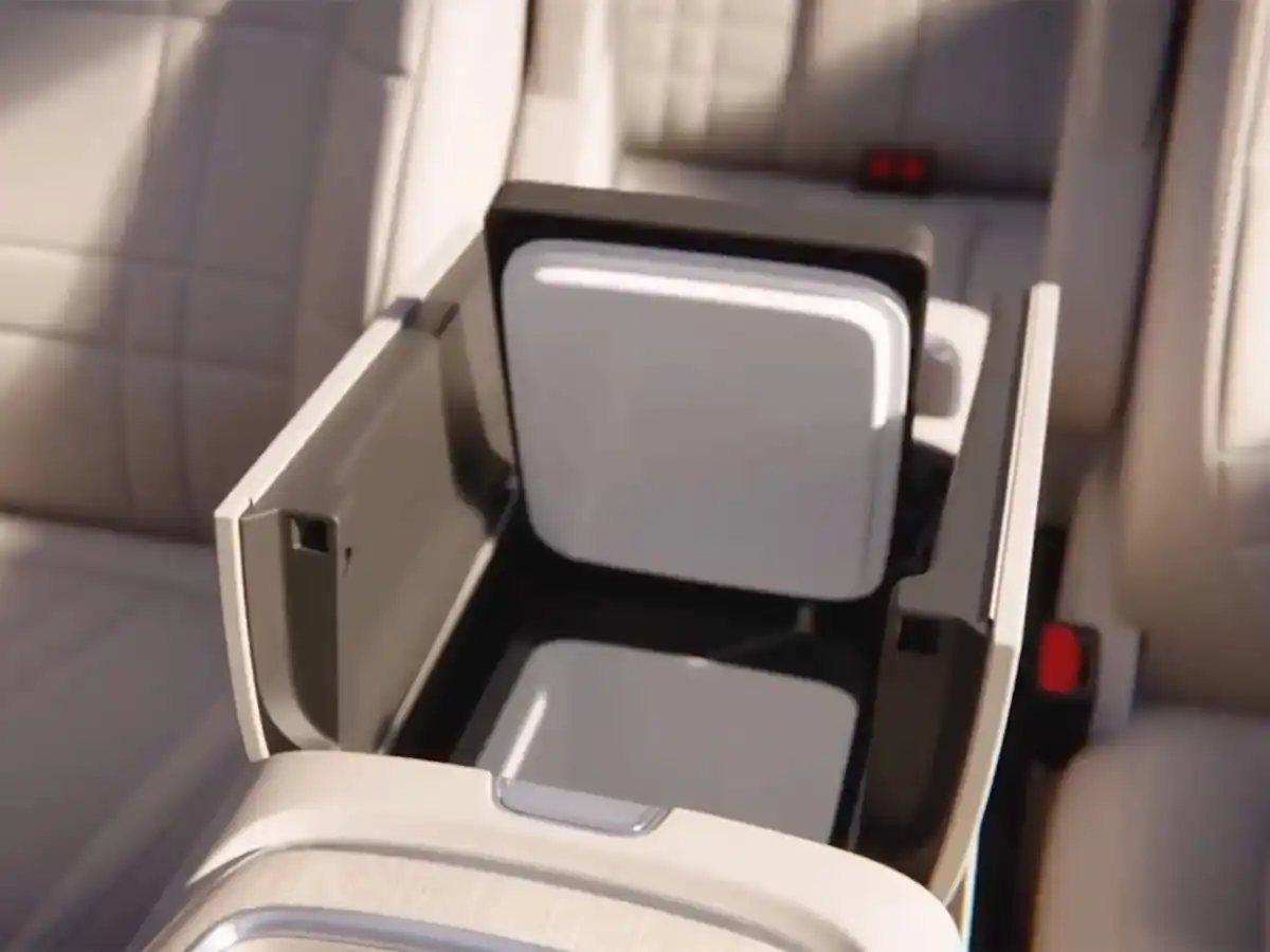 The center console is adjustable and includes a wireless charging pad and cup holders, with additional storage space underneath. The armrest houses a 10-liter onboard refrigerator, capable of both cooling (-6°C) and heating (up to 50°C). Rear passengers also enjoy added convenience with cup holders and a touch control screen.