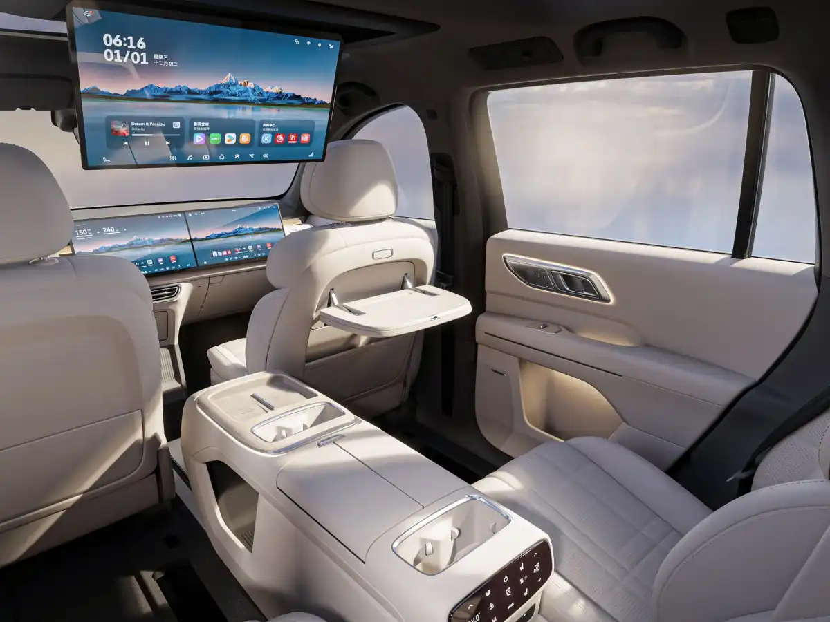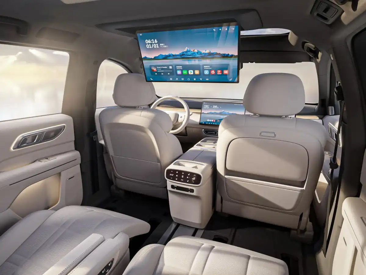 For entertainment, rear passengers can enjoy a 21.4-inch 3K ceiling-mounted screen, perfect for watching movies—an attractive feature for families.