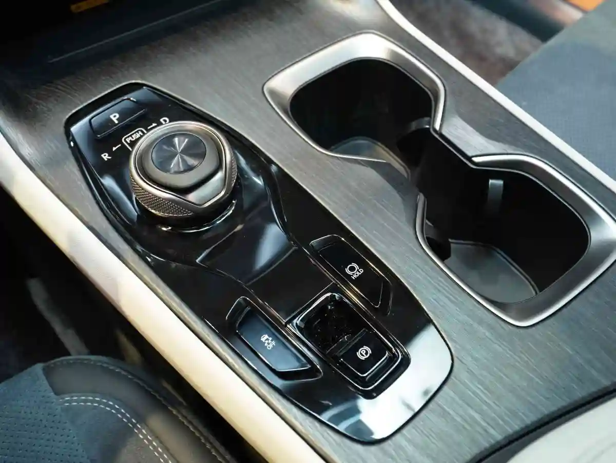 There’s a rotary knob for the electronic gear shift, uniquely shaped and complemented by a faux wood panel in the surrounding area, creating a refined atmosphere.