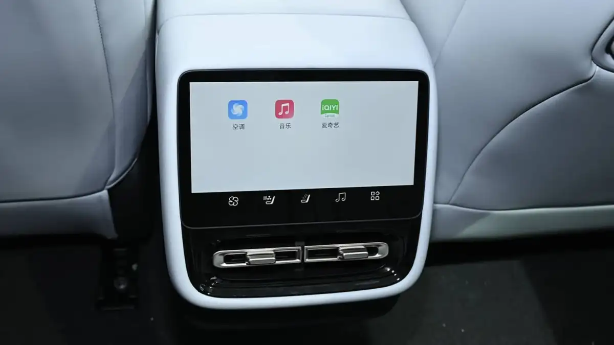The interior features a 15.6-inch main display and a gear shift lever positioned behind the steering wheel. The central tunnel contains two cup holders and two 50W wireless charging pads. The second-row seats of the P7+ offer electric adjustments, ventilation, and massage functions, except for the middle seat. There is also an 8-inch display for rear passengers, and the right rear passenger has a foldable table.