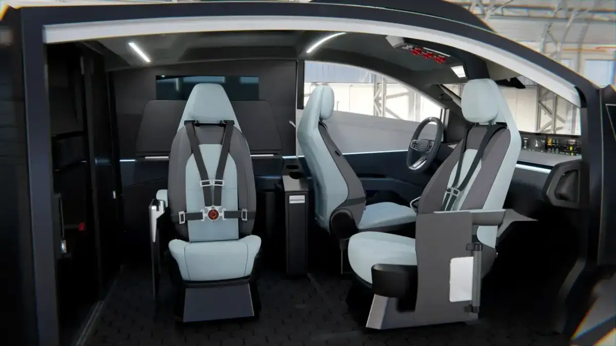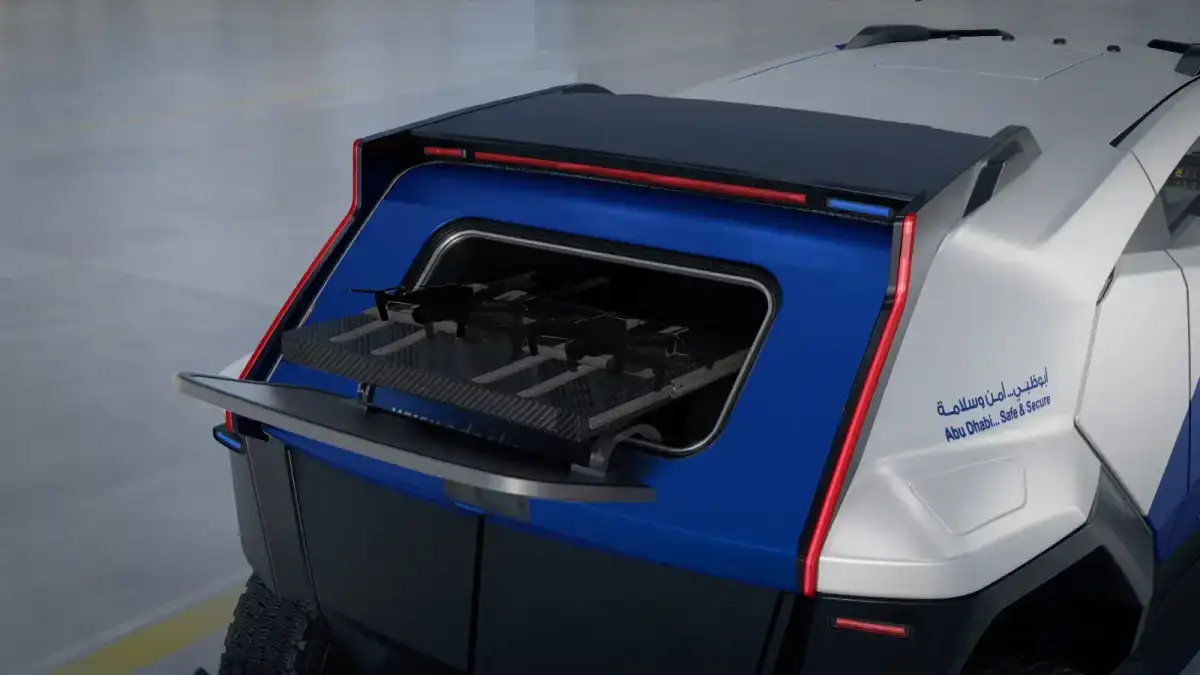 In addition, the vehicle features an upper rear hatch housing a compartment for two integrated drones. These drones are wirelessly charged and automatically deployed, providing continuous aerial surveillance in real time. Inside the cabin, a dedicated operator station with a 28 inch display functions as a full command center for field operations.