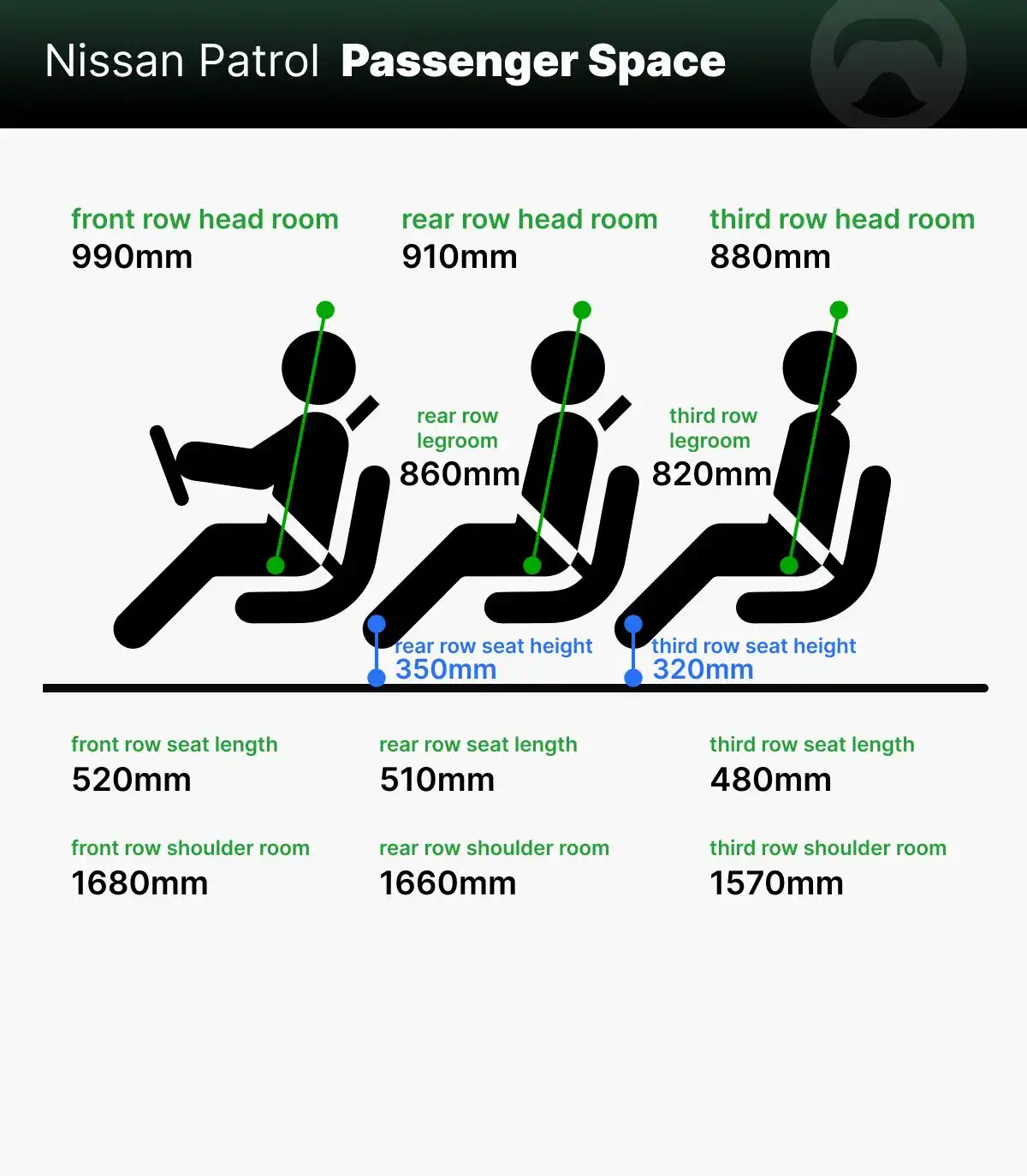 However, due to the Nissan Patrol's theater-style seating layout, the second-row Hip point is higher than the first row, and the third-row Hip point is higher than the second row. This results in progressively smaller headroom towards the rear. The advantage, however, is that both second and third-row passengers enjoy a clear, open view forward, reducing any sense of confinement.