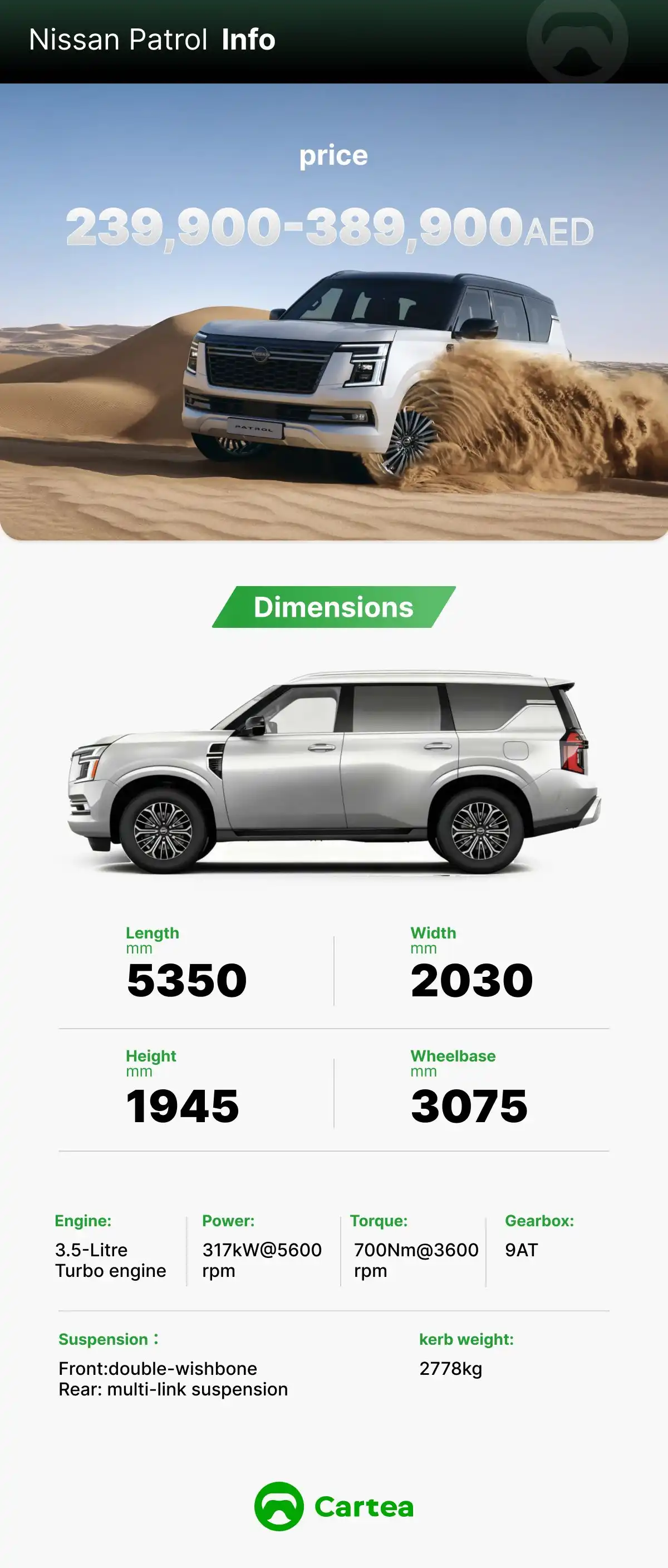 With dimensions of 5350*2030*1945mm and a 3075mm wheelbase, the Nissan PatrolUAE Nissan PatrolKSA Nissan PatrolKuwait Nissan PatrolQatar Nissan PatrolBahrain Nissan PatrolOman Nissan PatrolEgypt Nissan Patrol is a full-size SUV. It measures approximately 20 cm longer than the Land Cruiser. One key factor behind this difference is that the Patrol's overall length includes its tow hooks. Without them, its body length would be just over 5.2 meters, which is very close to that of the Land Cruiser.