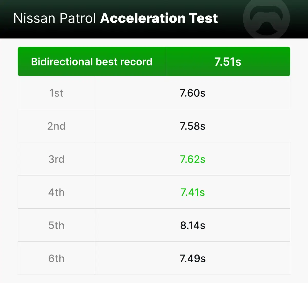 Patrol acceleration test: 5 pts / 7.51s