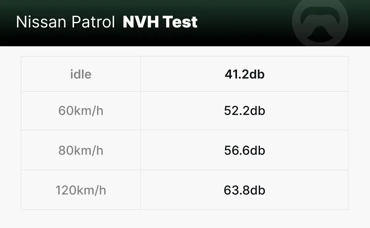 Based on our actual measurements, the noise level in the Nissan Patrol is 41.2 dB at idle, 52.2 dB at 60 km/h, 56.6 dB at 80 km/h, and 63.8 dB at 120 km/h.