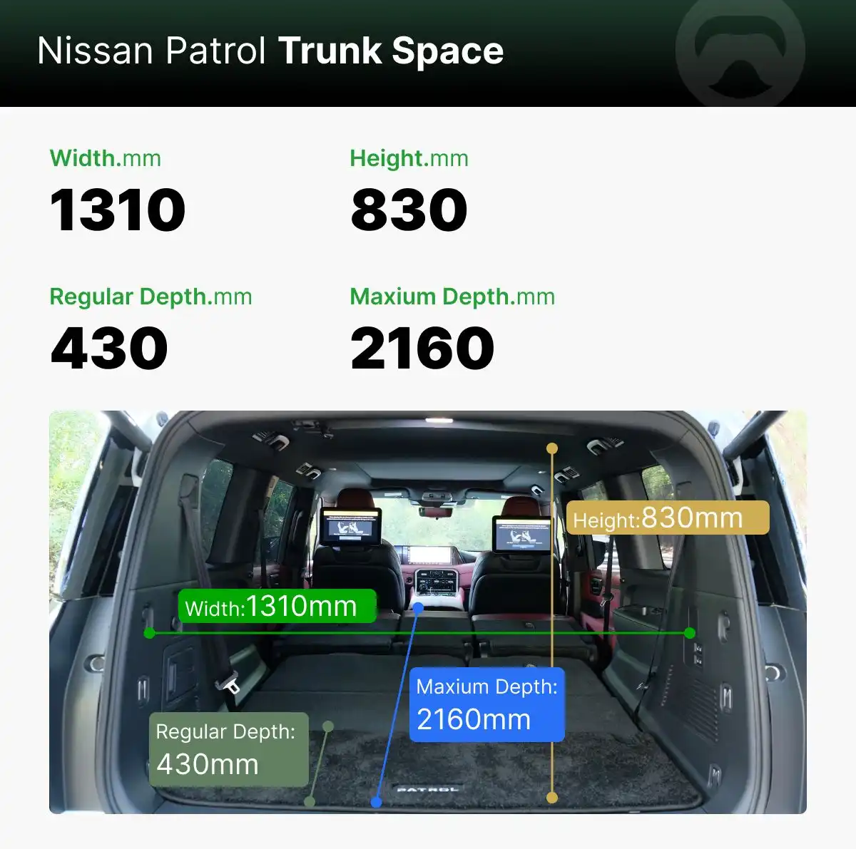 The Nissan Patrol's cargo area has a height of 830mm, a width of 1310mm, and a depth of 430mm under normal conditions, offering a capacity of 468 liters. The cargo space is relatively limited in its standard configuration—if a family of eight travels with luggage, it will definitely not be enough.