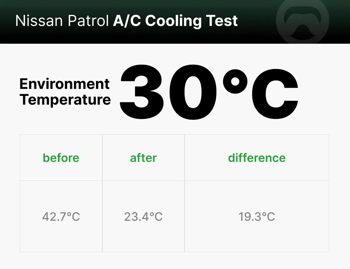Patrol A/C cooling test:Cools 19.3°C in 15 minutes.