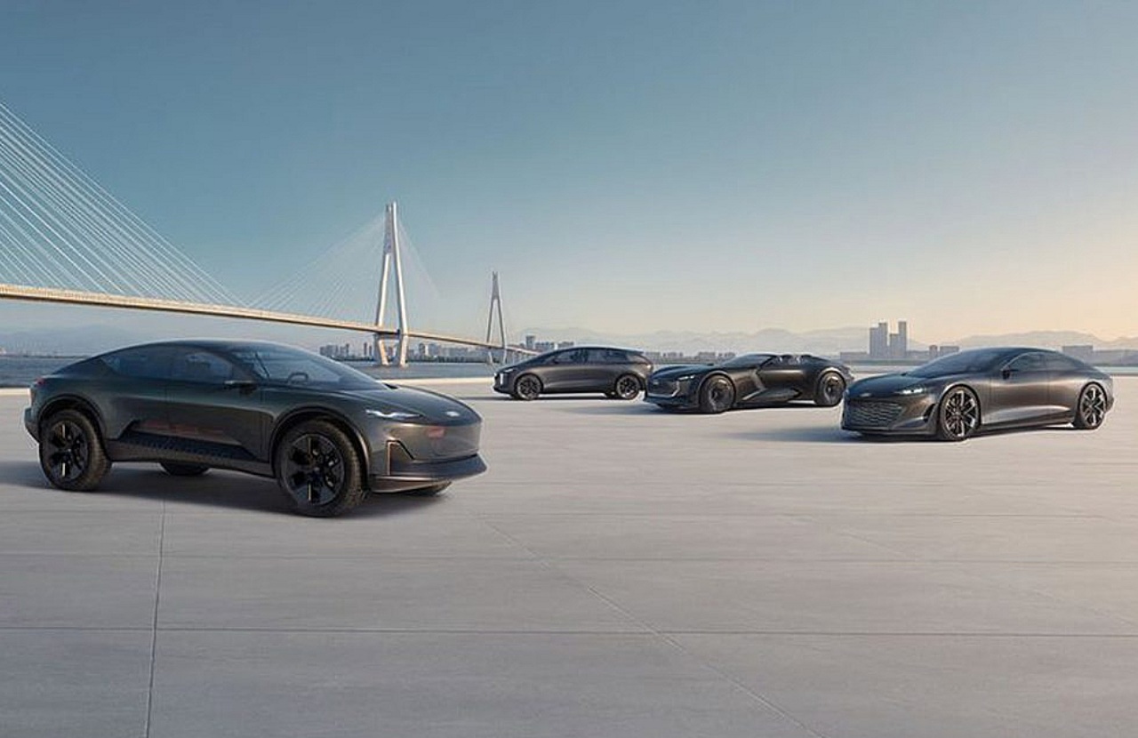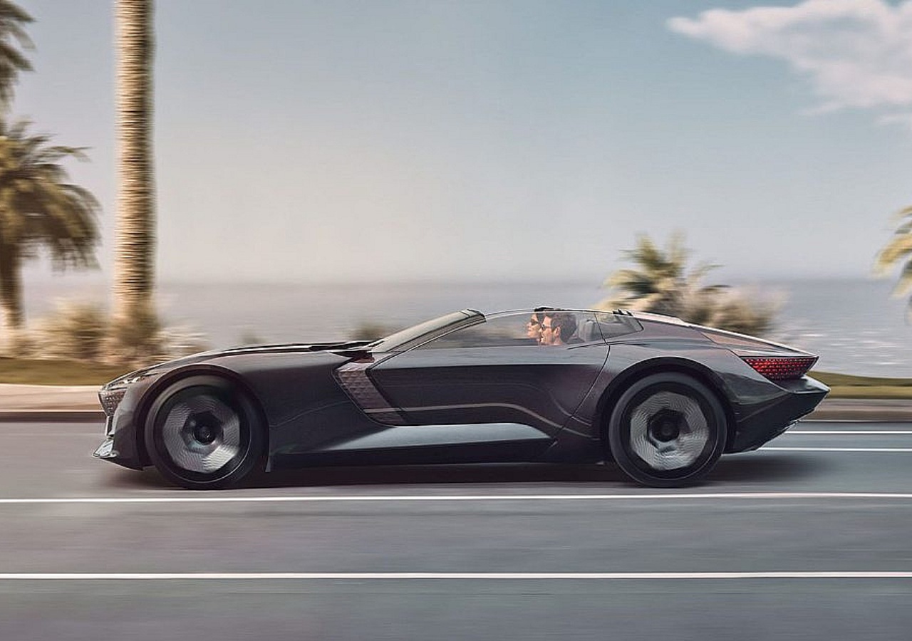 Minimalist, sculpture-like exterior—hints of classic Audi roadsters blended with 2050-style cues, all set off by dramatic light shows in each driving mode.