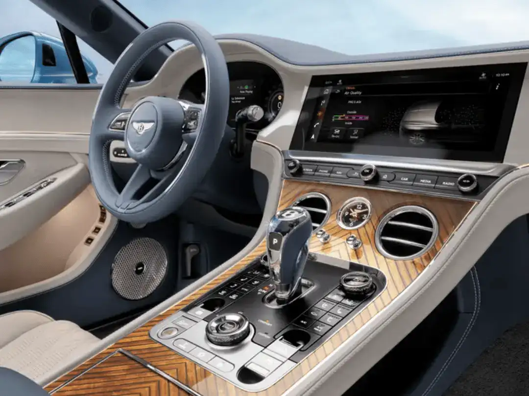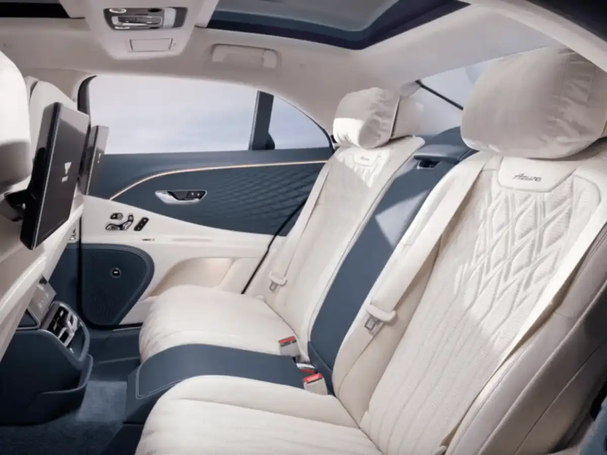 The Azure trim is distinguished by a chrome front grille with vertical slats, shiny chrome details on the bumper, and a gloss black front splitter. It also includes exclusive 22 inch wheels with Azure badges on the fenders. Inside, the cabin features diamond stitched leather upholstery and embroidered Azure logos on the headrests. The Continental GT Azure includes a panoramic sunroof, while the convertible version is equipped with neck warmers, ideal for cool autumn weather.