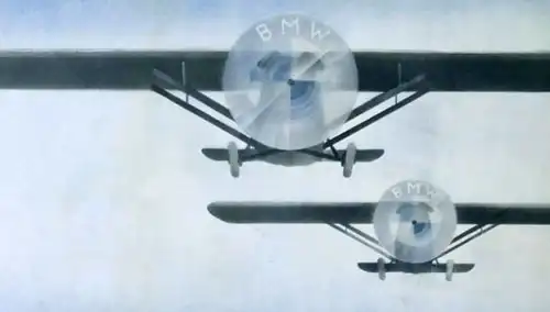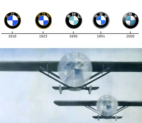 Old advertising material that showed an airplane with the BMW roundel superimposed on the spinning propeller, visually reinforcing that reading.