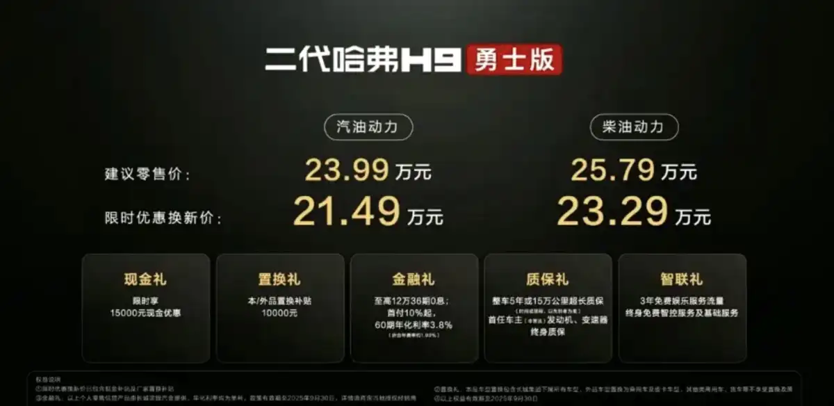 The Haval H9UAE Haval H9KSA Haval H9Kuwait Haval H9Qatar Haval H9Oman Haval H9Bahrain Haval H9Egypt Haval H9 Warrior Edition has officially gone on sale, offering two variants with prices ranging from 239,900 to 257,900 RMB (approximately $32,900–$35,400 USD)