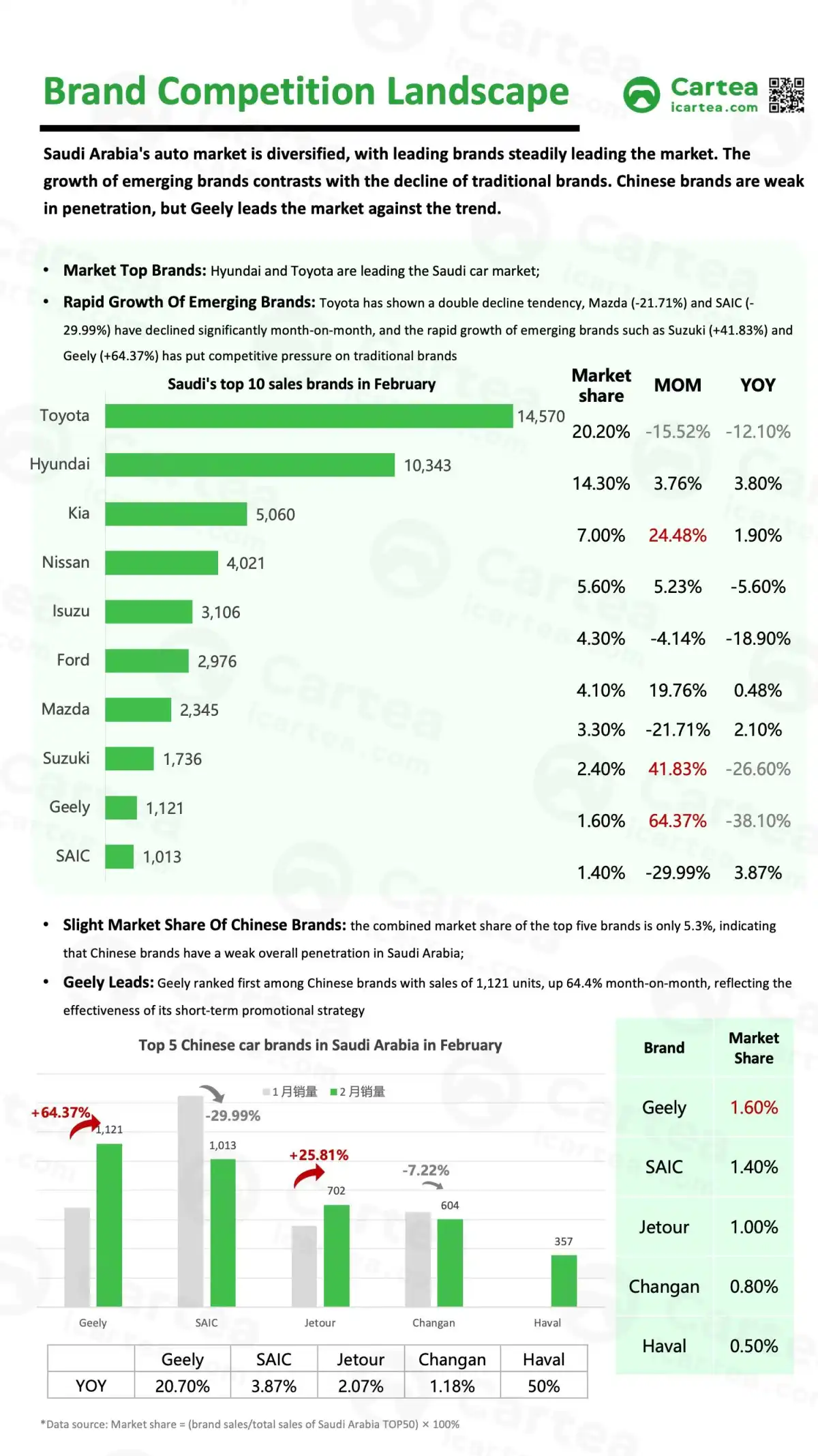 The Saudi automotive market currently displays a “tripolar” brand structure—established leaders maintaining dominance, emerging players rising swiftly, and Chinese brands gradually gaining a foothold.
