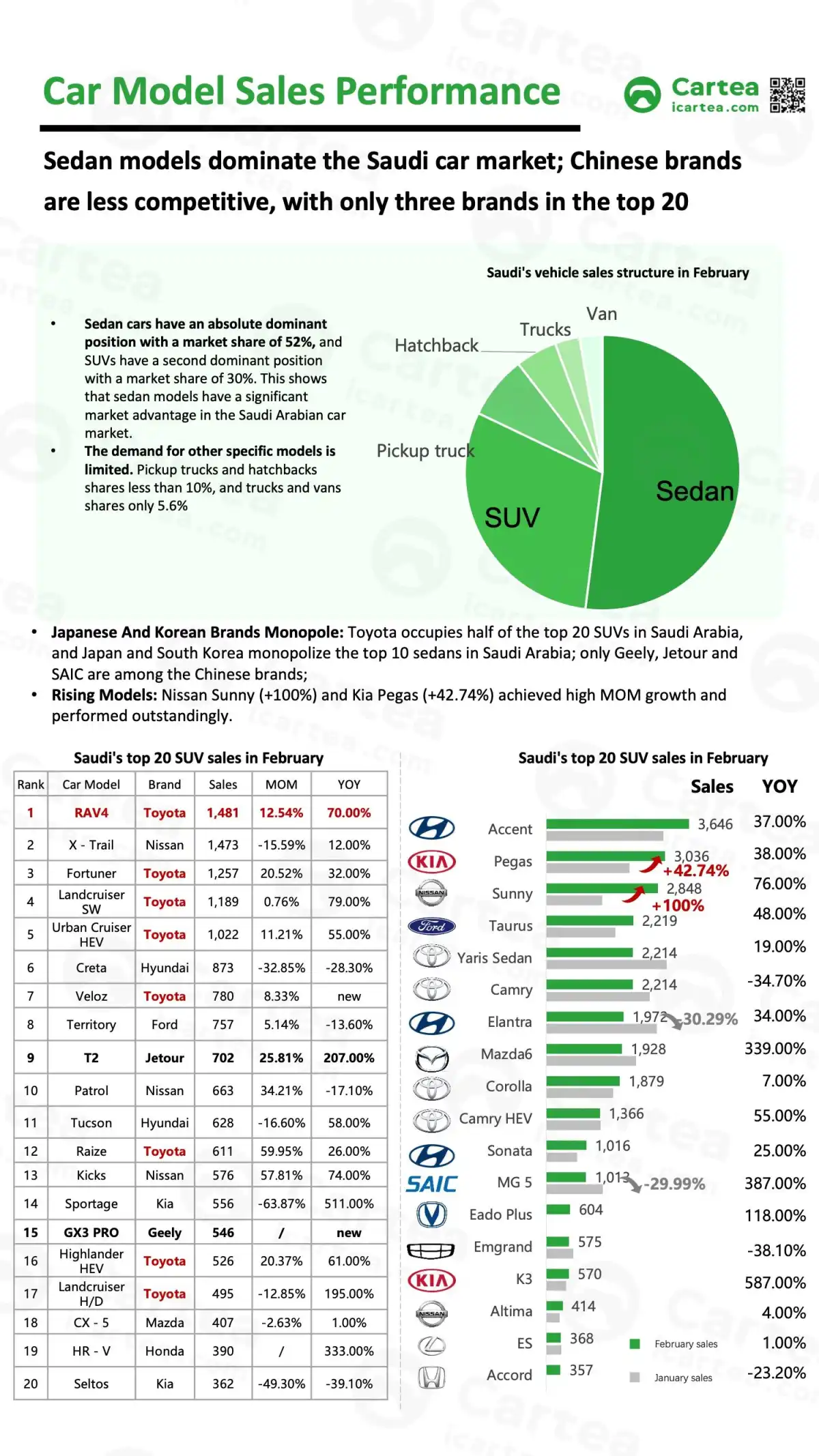 In February 2025, sedans accounted for over 50% of total vehicle sales in Saudi Arabia, while SUVs captured more than 30%. Japanese and Korean models remained dominant in both categories, whereas Chinese vehicles continued to struggle in attracting significant consumer interest.