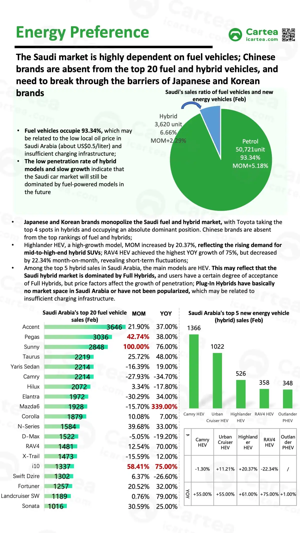 Based on sales and search data analysis, Cartea provides a comprehensive interpretation of the Saudi automotive market from three core dimensions: brand structure, energy preference, and vehicle type demand.