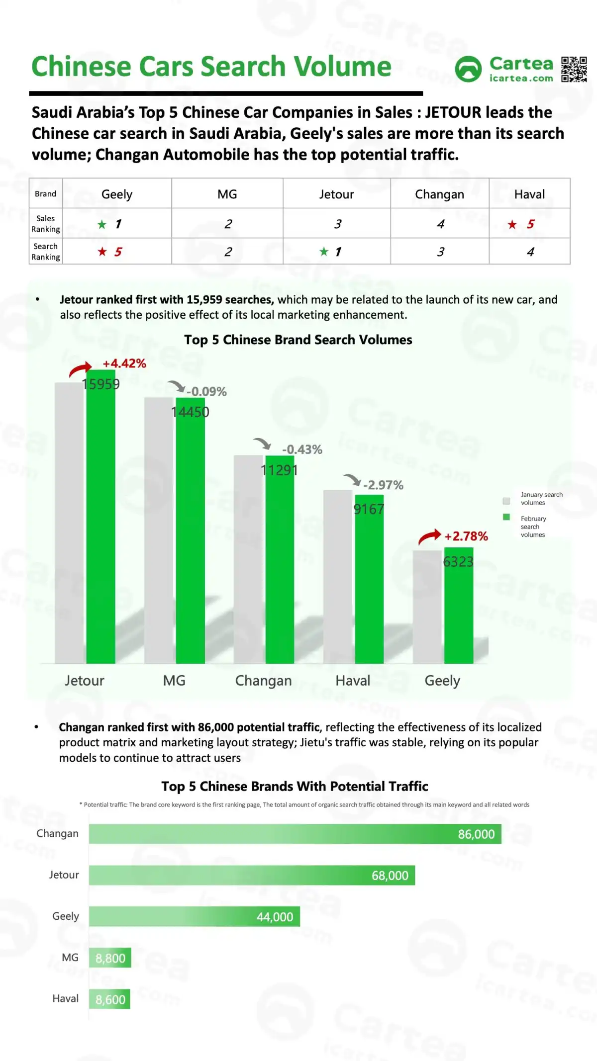Jetour led with 15,959 searches, likely driven by a recent model launch and reflecting the positive impact of intensified local marketing efforts. Meanwhile, Changan topped in potential traffic volume with 86,000 visits, indicating the effectiveness of its localized product lineup and marketing strategy in Saudi Arabia.