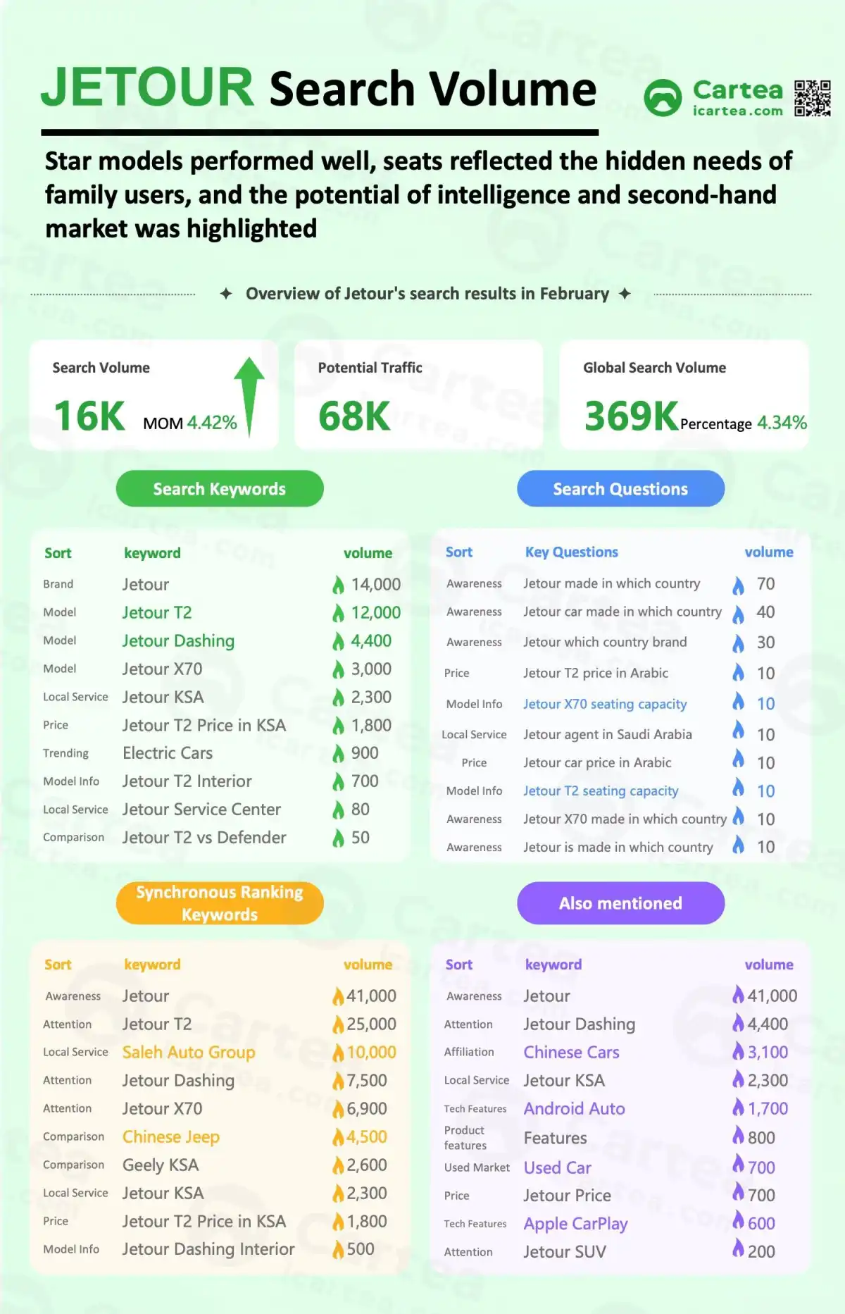 Searches frequently associate Jetour with local dealership groups, used cars, and the broader “Chinese car” category. A dual strategy is recommended: address user pain points (used cars/family needs) while reinforcing brand trust(highlighting dealer reliability and Chinese automotive quality).