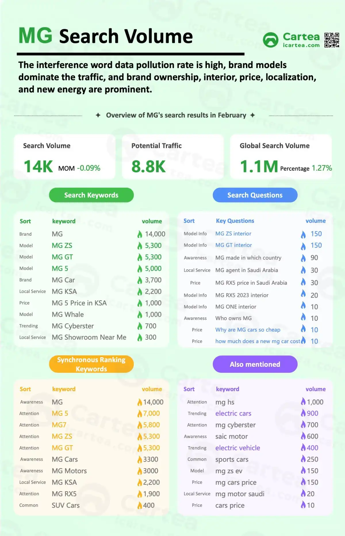 Keywords like MG ZS, GT, 5, and 7 account for 76% of total search traffic.