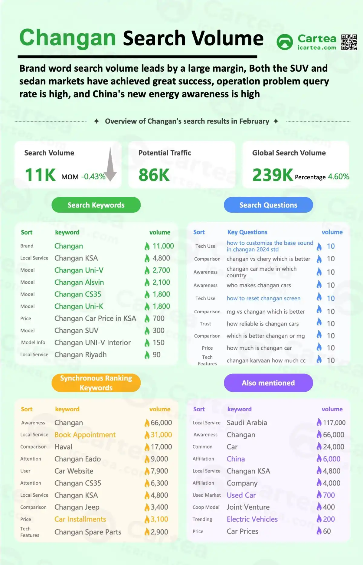 High association with keywords like used cars, Chinese cars, and electric vehicles. Changan enjoys relatively high trust among Saudi users compared to other Chinese brands.
