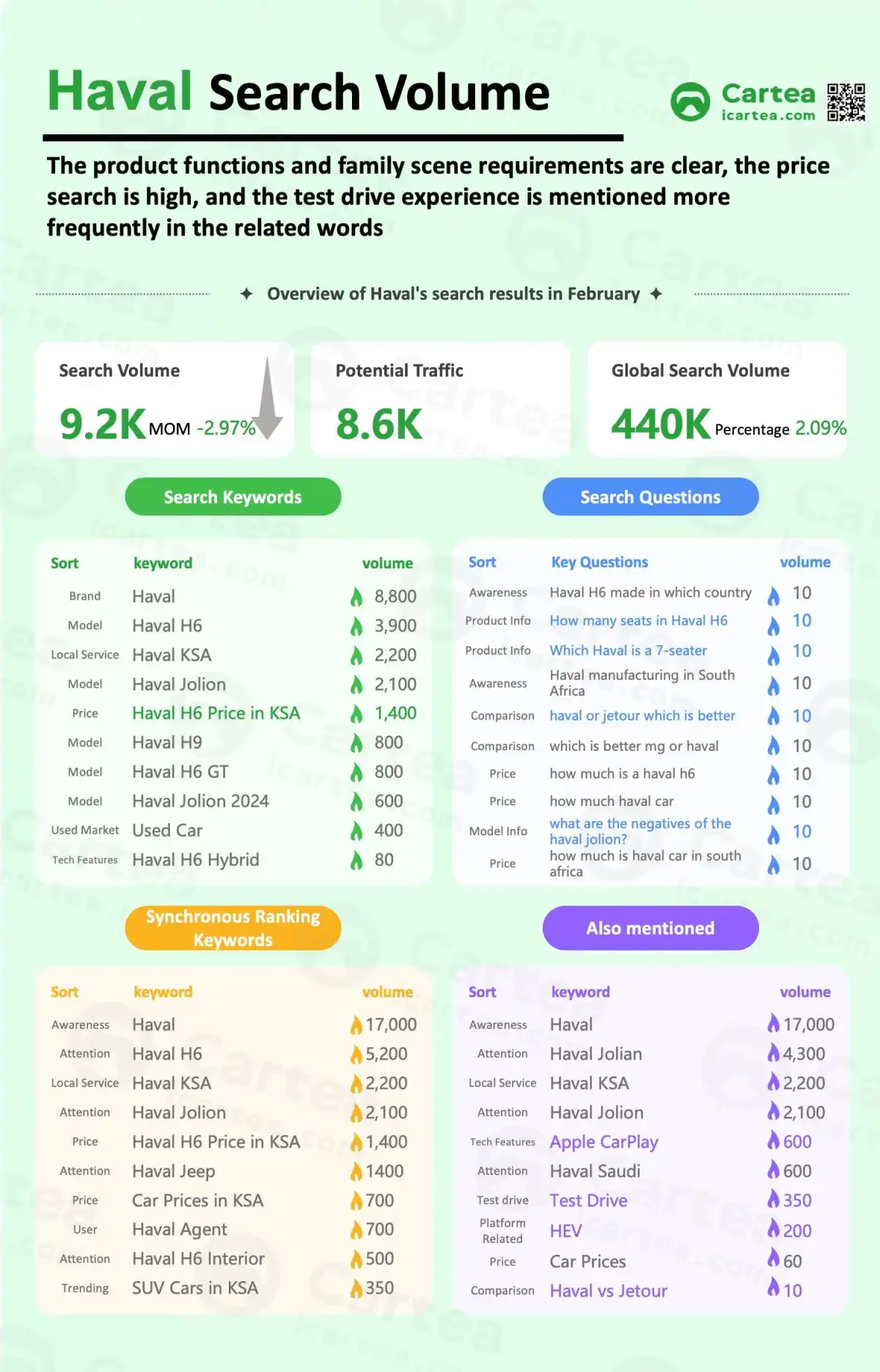 Searches like “number of seats,” “7-seat models,” and “interior” reflect strong demand for practical, family-friendly vehicles. Haval effectively targets both young consumers and family SUV buyers.