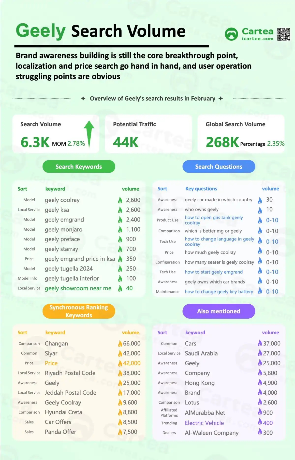 Coolray and Emgrand make up 47% of total searches, indicating that user perception is anchored in compact SUVs and sedans. Users are highly interested in the brand’s origin and corporate reputation.
