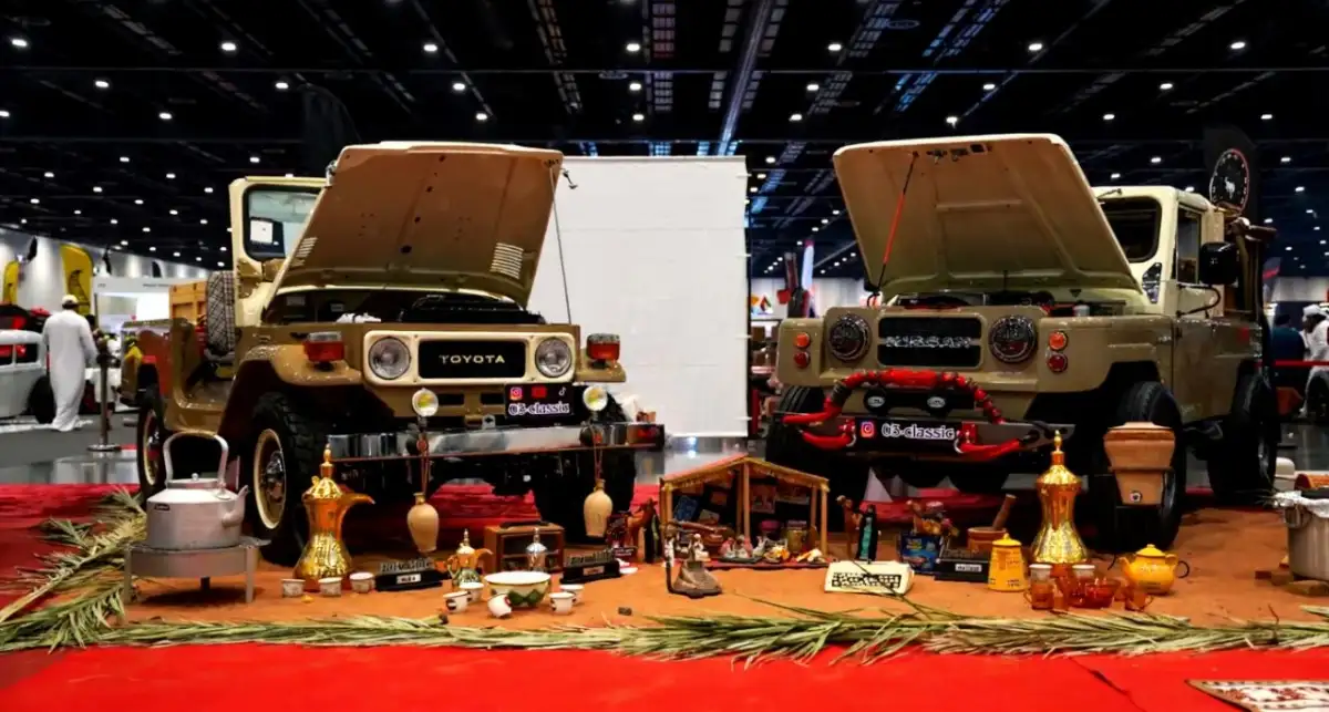 “Time Tunnel” displays paired vintage 70s–90s Land Cruisers, Patrols, and Defenders with today’s 1,000hp dune-bashers—showcasing the region’s love for SUVs across generations.