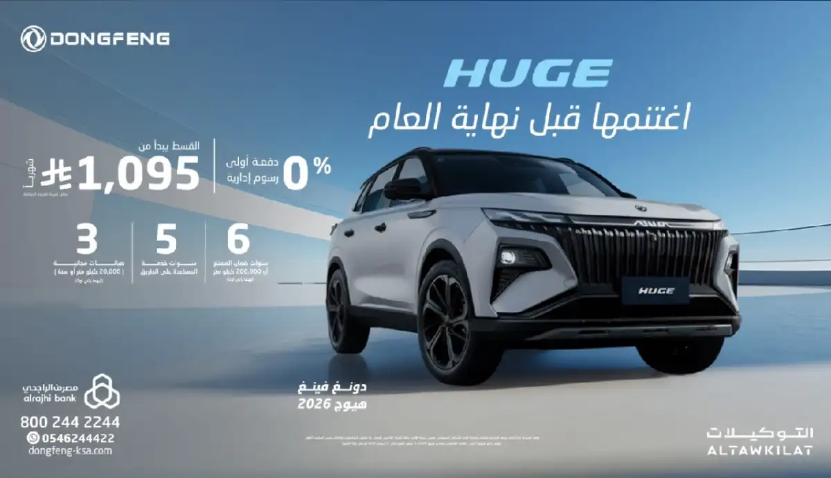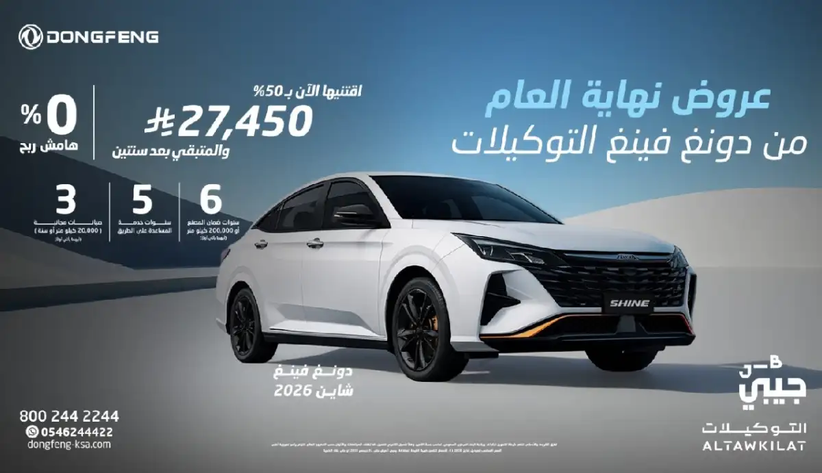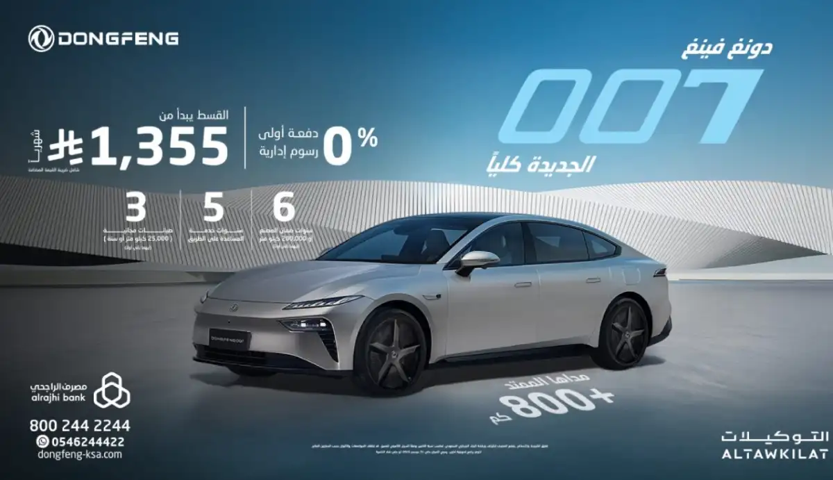To mark the end of 2025, Dongfeng Saudi Arabia, through its dealer Universal Motors Agencies, launches a set of financing offers on selected models, in cooperation with Al Rajhi Bank. The offers focus on payment flexibility, canceling the down payment and administrative fees in some programs, along with warranty coverage up to 6 years or 200,000 km, roadside assistance, and free maintenance services.