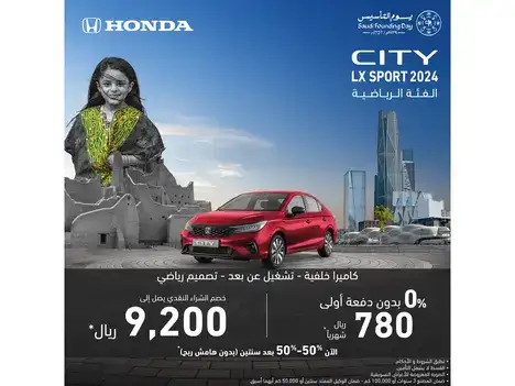 Choose the purchase method that suits you best and own a Honda City 2024 with the Saudi Founding Day 2025 offers provided by Abdullah Hashim Co. Purchase methods: No down payment & a monthly installment starting from 780 SAR 50% payment now and 50% after two years, without a profit margin A 9,200 SAR discount on cash purchase You can benefit from this offer by clicking on Apply for Finance to fill out the application, then a representative will contact you as soon as possible to let you know of the next steps (Terms and conditions apply).Read less