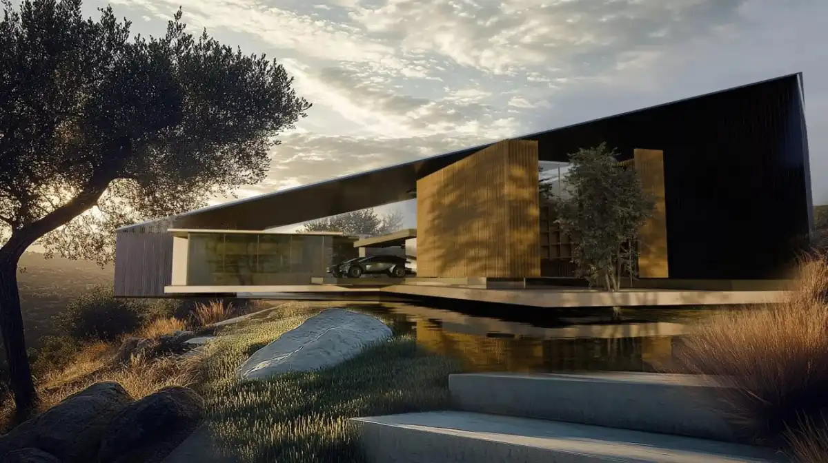The house blurs boundaries between indoors and outdoors; the top floor is imagined as a gallery space facing sweeping views and designed to showcase your Lexus among curated furnishings.