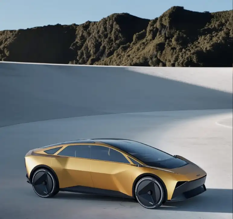 In the short video Kia released globally, the car appears in a calm sunrise scene, where rays of light gradually fall across its body lines to reveal fine details in the design. The shiny golden paint gives the feeling of a futuristic and premium vehicle, while the sharp angles in the front and rear lighting highlight an aggressive design direction that clearly reflects its sporty character. The glass roof, divided into several separate sections, adds an advanced technological touch and enhances the sense of spaciousness and transparency inside the imagined cabin, even though Kia has not yet revealed any official images of the interior.