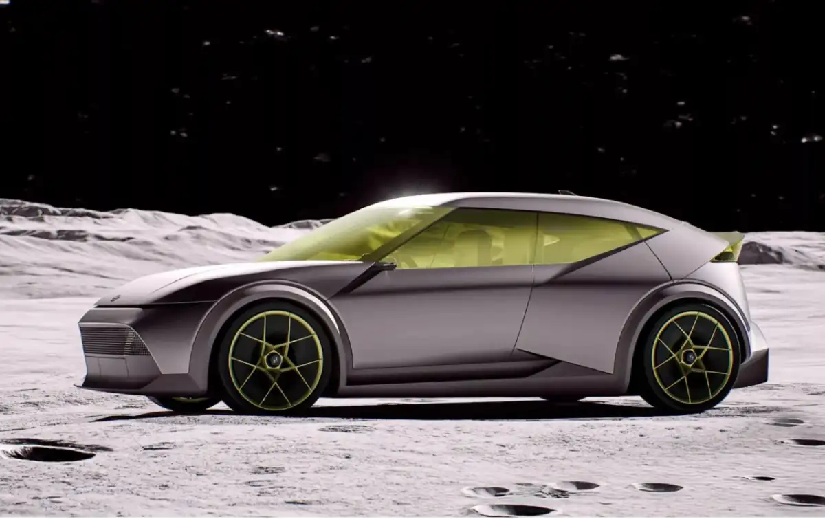 Large wheels and lemon-colored tinted windows add a unique flair, though such elements may be toned down in the production version.