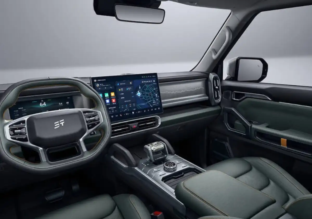 The JETOUR T2 separates itself with muscular lines, adaptive LED headlights and taillights, 20-inch sports wheels, power-folding mirrors with memory, running boards, and a smart electric tailgate. Its front profile exudes a bold identity featuring a luminous “JETOUR” badge.