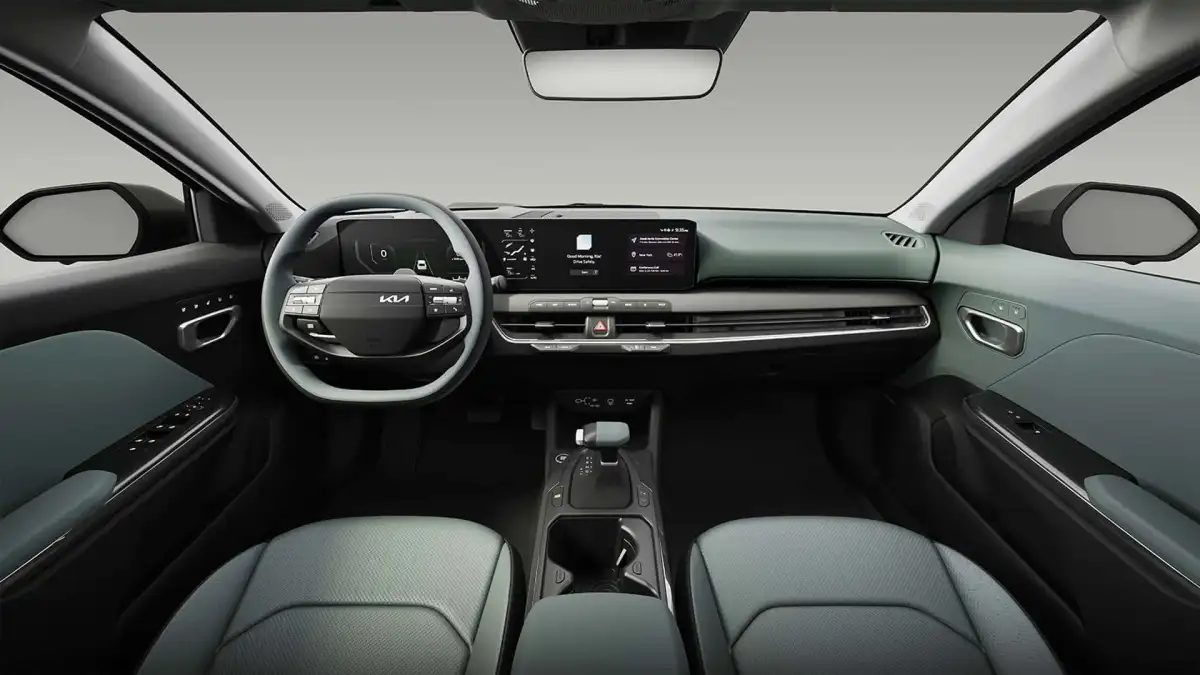 The interior features a square steering wheel and a wide infotainment screen, with design elements influenced by the EV6, EV9, and the refreshed Sorento. Unlike these models that utilize a rotary gear shifter, the K4 opts for a traditional gear lever positioned on the center console.