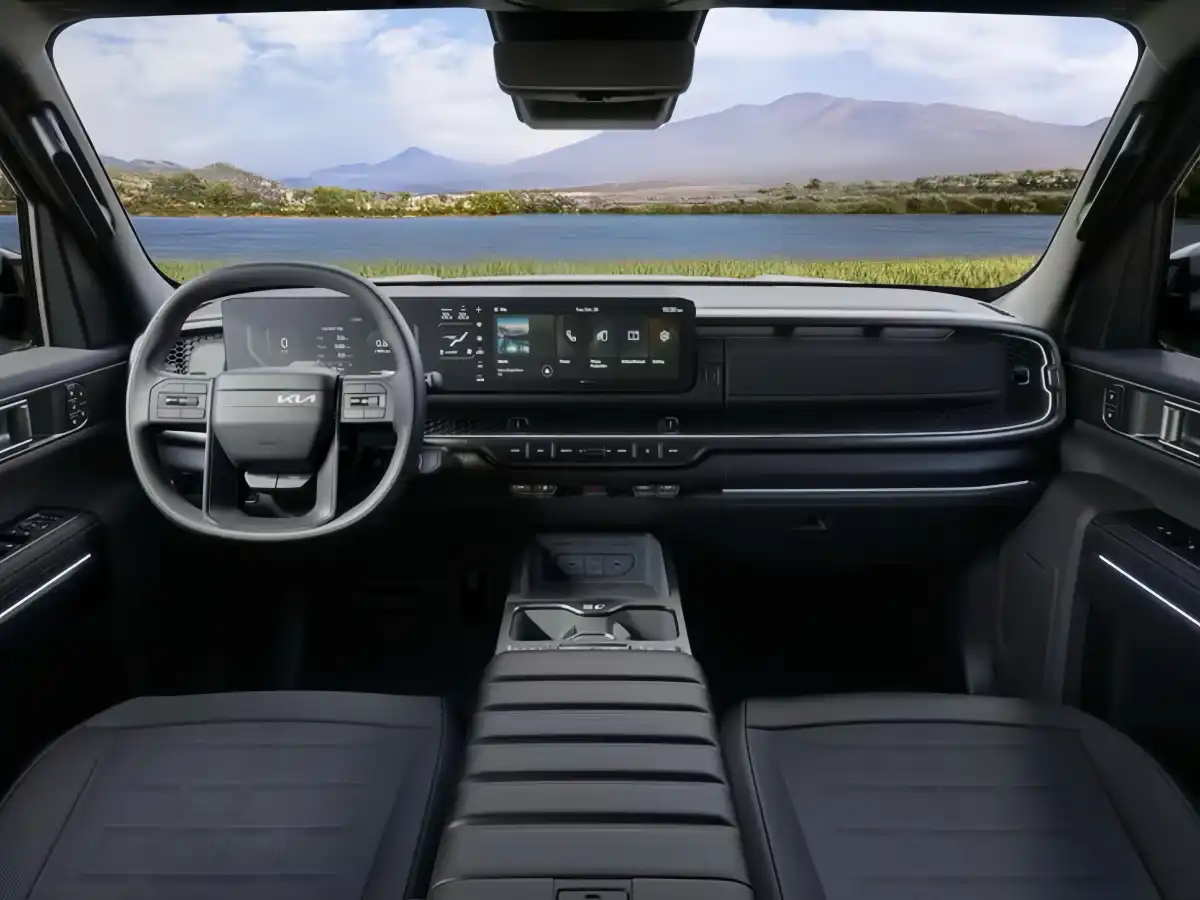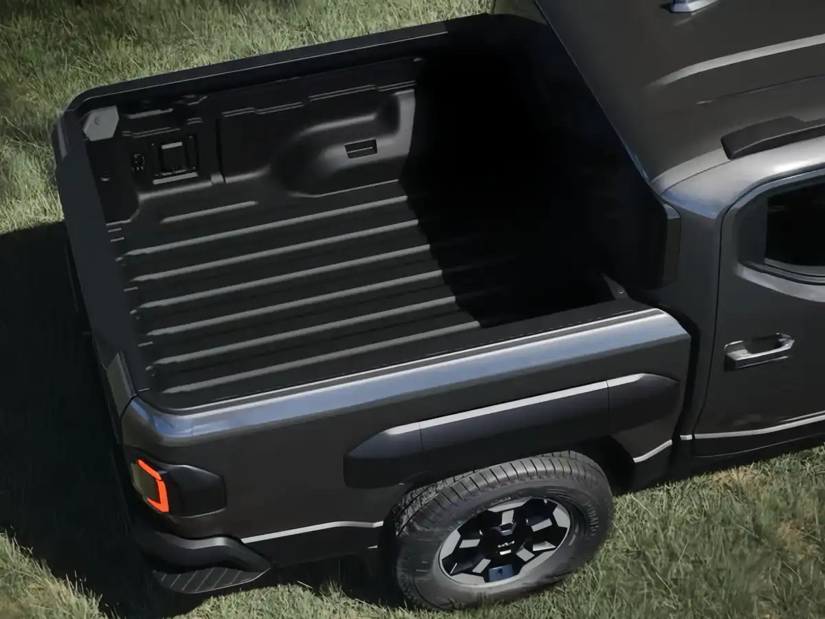 At the front, the sculpted hood, blacked-out Kia badge, and bold black accents give the truck an unmistakably tough appearance.