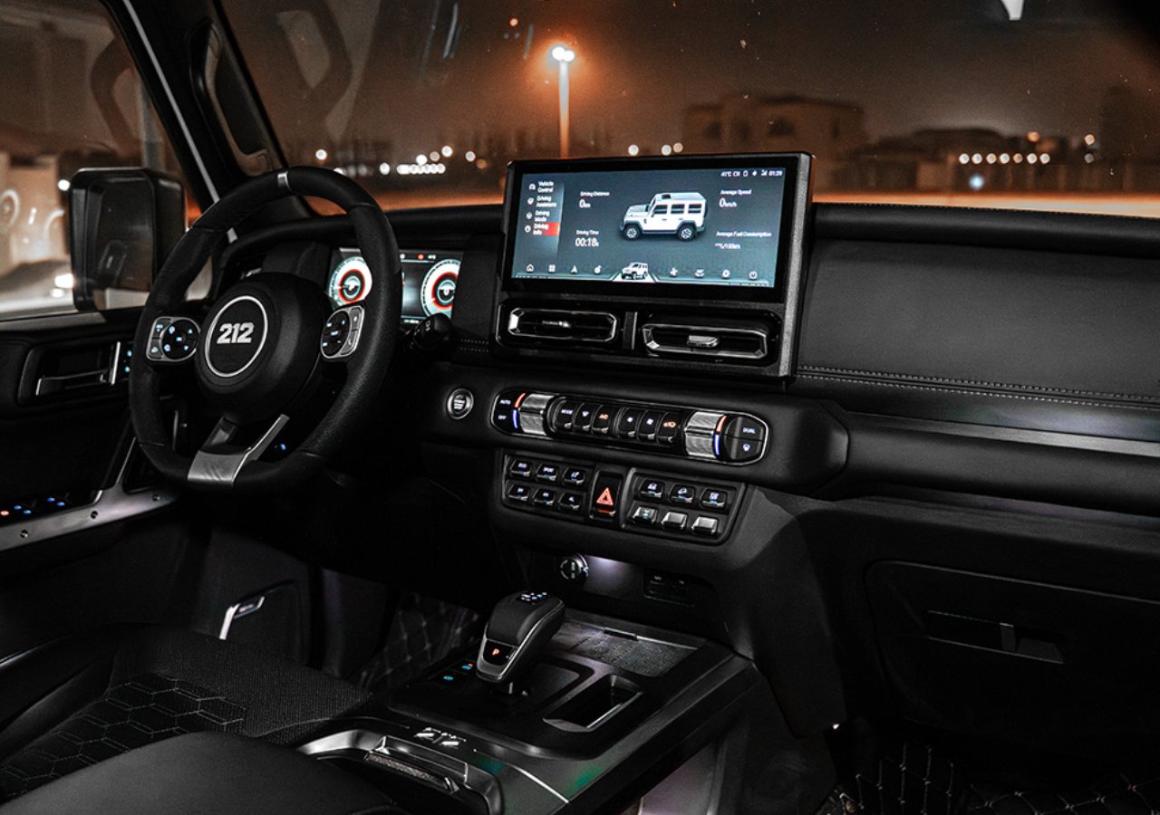 - 212 T01 sports classic, boxy proportions reminiscent of expedition trucks, with an assertive grille, LED lighting, and pronounced fender flares that ensure dominance on rough terrain.