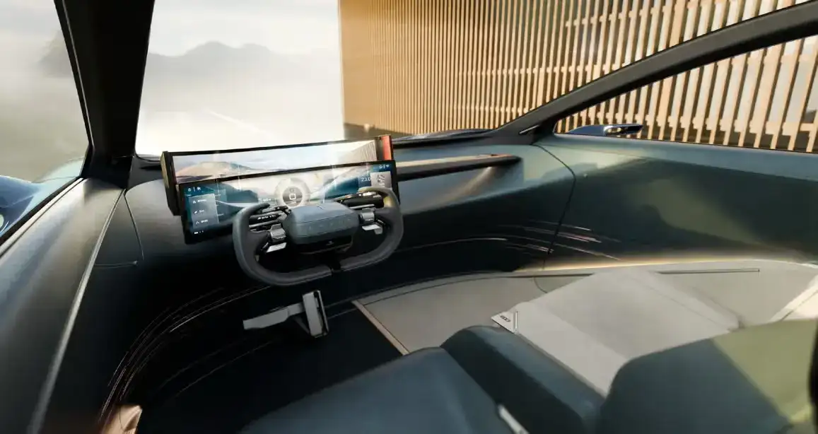 U-shaped steering wheel with dual driver screens for a futuristic layout.