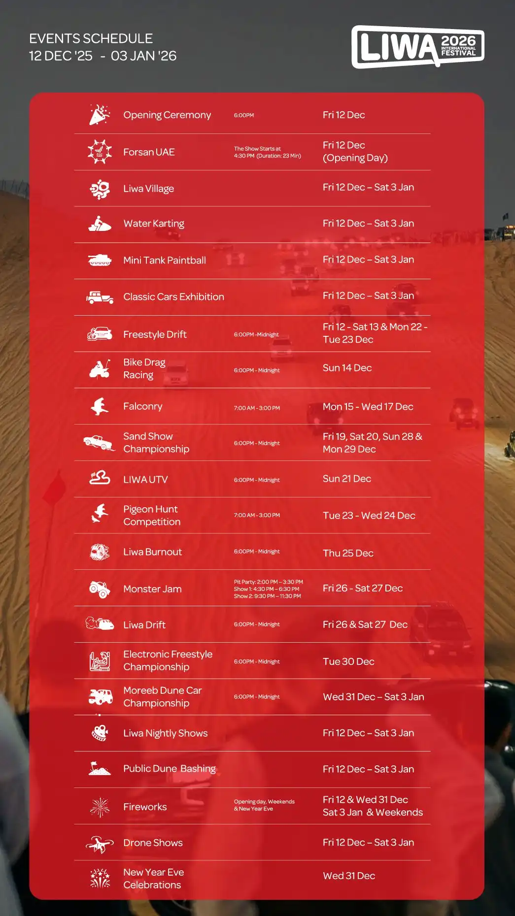 Welcome to save the events schedule of the 2026 Liwa International Festival. Please keep it safe and enjoy your journey!