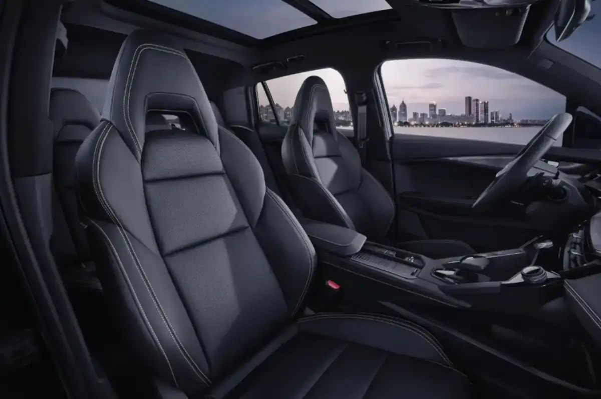 The 2025 Lynk & Co 06 arrives with a bold exterior design that reflects its sporty essence through sharp character lines flowing from the hood to the upward swept LED headlights, enhancing its modern appeal. A wide front grille anchors the face of the car, giving it a confident road presence, while the black roof adds a striking visual contrast that further elevates its contemporary styling. The panoramic sunroof, available in the Hyper Halo trim, brings an open air feel to the cabin, creating a sense of spaciousness and light.