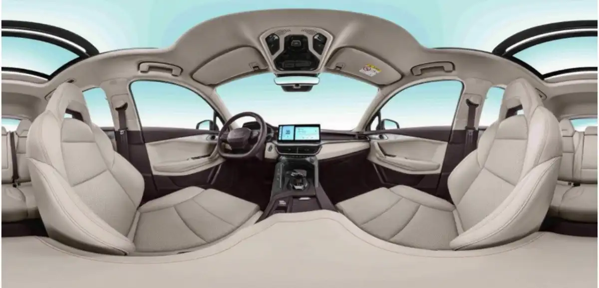 Customizable ambient lighting, wireless charging for devices, six-speaker premium audio.