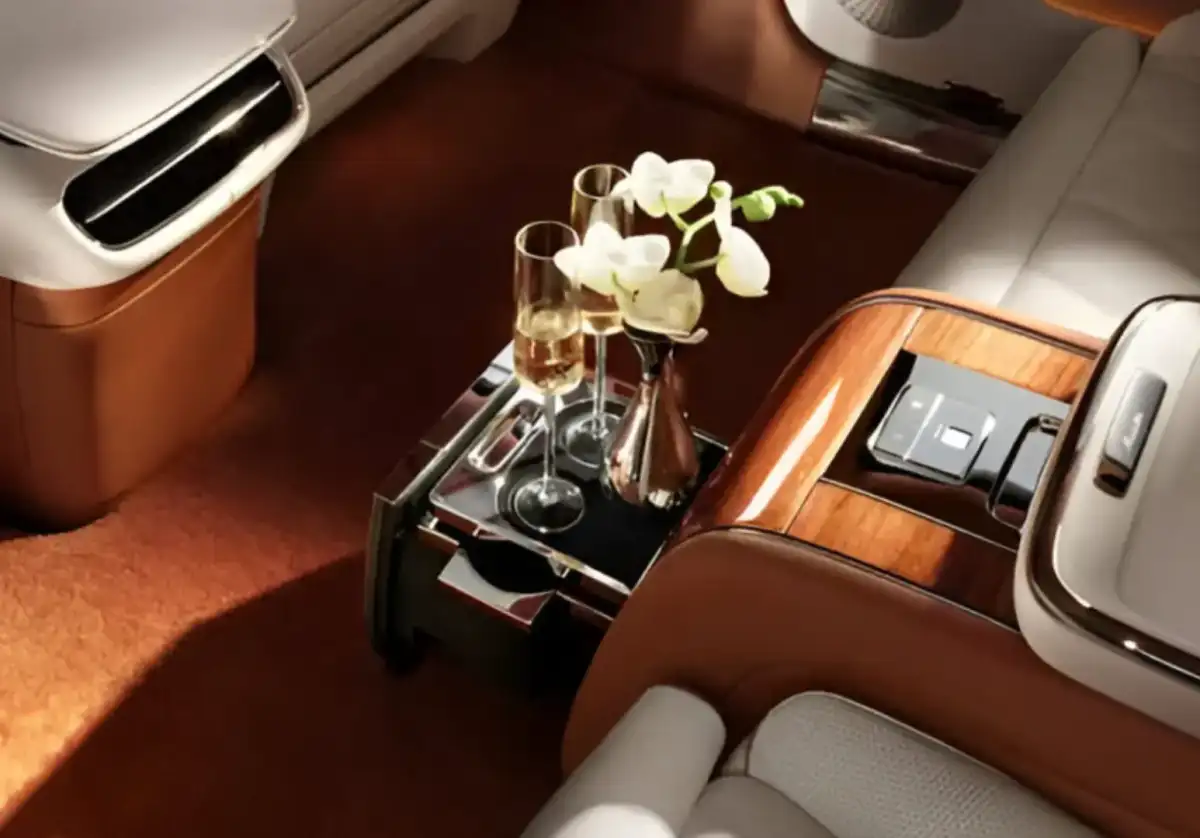 The rear cabin is elevated further by a meticulously crafted central console that includes foldable aviation style tables, a dual zone refrigerator with UV sterilization, and a fingerprint secured safe. Smart cup holders with both cooling and heating functions complete the luxurious atmosphere, rivaling the standards of high end private jets.