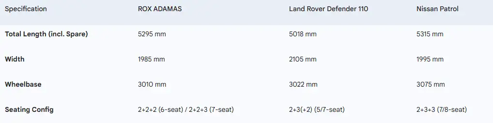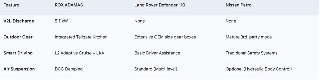 Desert Capability: The Land Rover Defender, with its air suspension and Terrain Response 2 system, offers the highest mechanical margin for error. The ADAMAS demonstrates the advantages of electric drive with its 740 N·m torque during half-slope starts. The Nissan Patrol provides the strongest psychological security in extreme environments thanks to its mechanical locks.