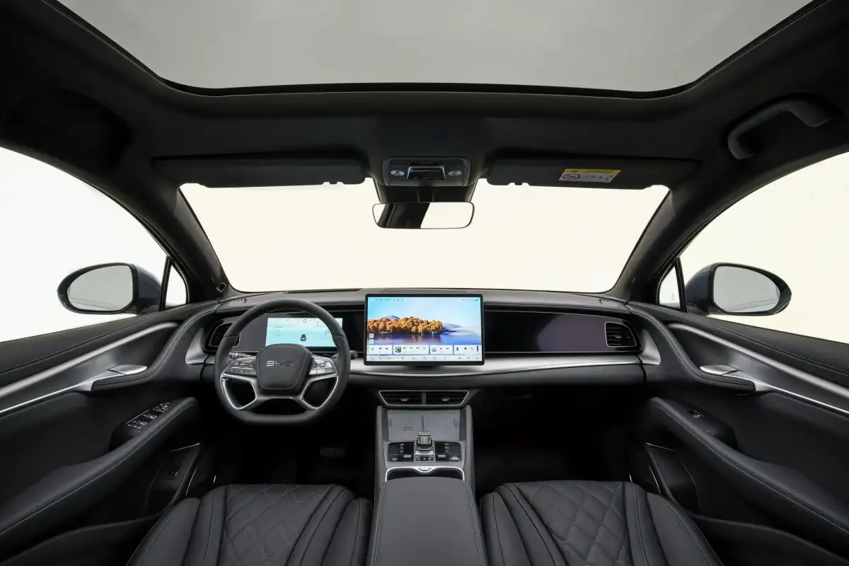 The cabin showcases premium materials alongside sound insulating, heat retaining glass. An electronic curtain atop the panoramic sunroof lets occupants fine tune incoming light. A head up display projects key driving data onto the windshield, helping the driver maintain focus, and dual zone automatic climate control filters particles down to PM2.5 for cleaner air.