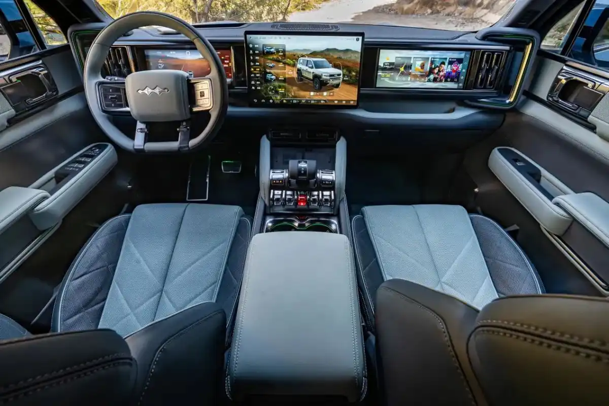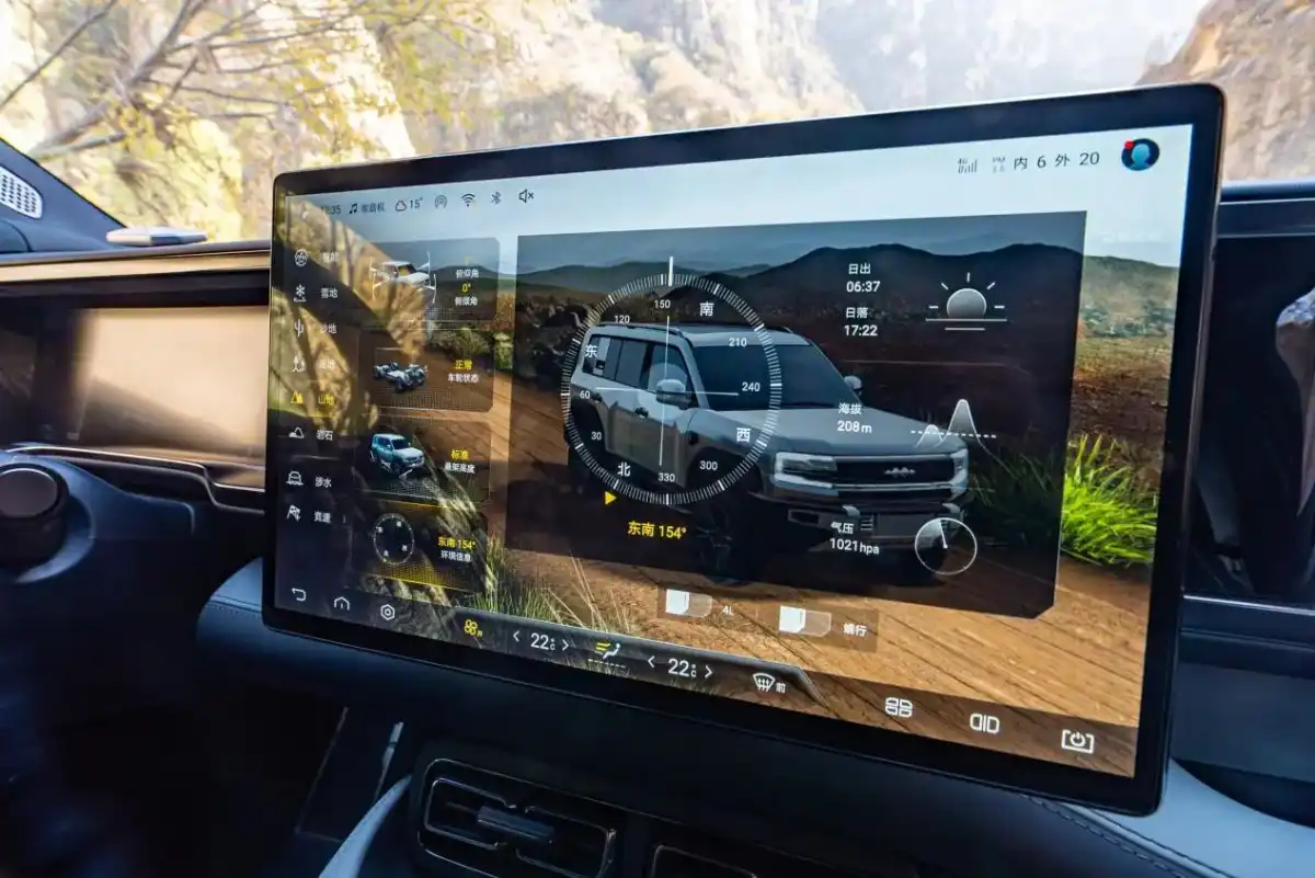 The centre console section carries a total of three screens, with a 15.6-inch 2.5K HD central multimedia centre screen in the centre and a 12.3-inch instrument screen for the main driver.The passenger seat carries a 12.3-inch multimedia entertainment screen.The overall use is very smooth, the UI interface is also very intuitive, and supports split-screen display, such as off-road driving mode of this interface, you want the information, such as direction, altitude, barometric pressure are very clear in front of you.
