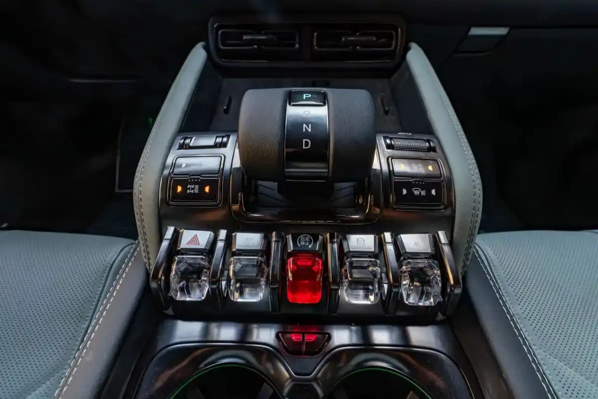 The centre console part of the lift shift lever, around the handle are front and rear differential lock, window defogging, EV/HEV switching, 4L and other commonly used function buttons, the function label is very clear, the size of the buttons is large enough, in the actual driving is very easy to find a certain function, in addition there is also a colourful egg, when starting the vehicle the handle will be automatically raised, turn off the engine the handle will be lowered, a sense of ceremony. Moving on, below the shifter is an arrangement of crystal clear buttons, which are presented in a modern industrial style finish. The front and rear differential locks feature physical buttons for easy operation by the driver.